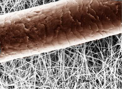 细丝柔滑:电纺纳米纤维直径~500nm,仅普通纤维的千份之一