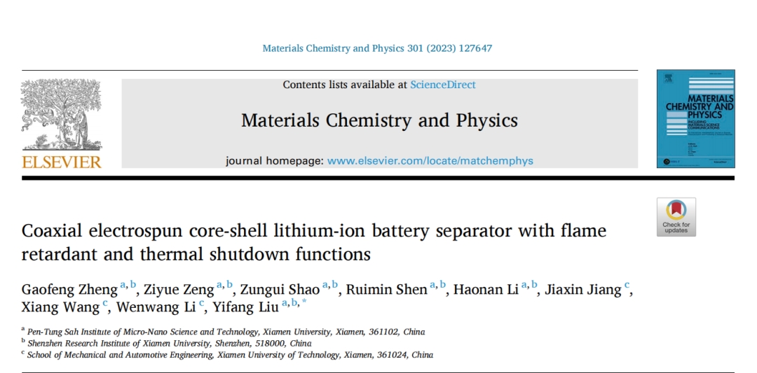 近日,厦门大学萨本栋微米纳米科学技术研究院郑高峰副教授团队针对批量制备具有阻燃热关闭功能的芯壳型锂离子电池隔膜开展研究。本文创新性地对芯壳纤维的热变形过程进行了模拟,分析了具有最佳阻燃性和热停机性能的芯壳比,此外,采用护套聚焦多喷嘴共轴静电纺丝实现了TPP@PVDF的批量制备。相关工作以“Coaxial electrospun core-shell lithium-ion battery separator with flame retardant and thermal shutdown functions”为题发表于国际重要期刊《Materials Chemistry and Physics》(影响因子4.778,JCR3区)。