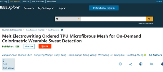 近日,厦门大学航空航天学院郑高峰教授团队采用熔融静电纺丝技术可控地构建了疏水热塑性聚氨酯(TPU)柔性微纤维网作为汗液采样层,实现比色汗液传感器的按需检测。通过精确有序地沉积具有不同孔径和堆积层数的TPU微纤维网,实现对不同水量的门控;同时,通过运动标定实验确定了TPU网格的最佳参数,大大提高了比色汗液传感器的使用效率(22倍)和稳定性(418%),大幅提升了可穿戴汗传感器在剧烈运动中的舒适性和适用性。相关工作以 “Melt Electrowriting Ordered TPU Microfibrous Mesh for On-Demand Colorimetric Wearable Sweat Detection” 为题发表于国际重要期刊《IEEE Sensors Journal》(影响因子4.325,JCR升级版2区,中国仪器仪表学会推荐T1期刊)。