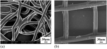 图3. 电纺堆叠层数分别为5和6层的TPU微纤维网电镜图
