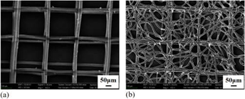 图2. 电纺参数与孔径优化前后的TPU微纤维网电镜图