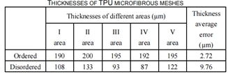 研究者通过调整电纺参数(电压、针尖到收集板距离、平台位移速率、供气速率)消除了TPU射流在电场下的螺旋鞭动过程,实现了精确定点直线沉积(图1)。随后,研究了纤维直写网格孔径与堆叠层数对所制备TPU微纤维网沉积形貌的影响。电纺参数对TPU微纤维网的形貌有重大的影响,若是参数调整不当,纤维将因电场力作用产生不稳定的鞭动,呈现混乱的排布(图2a),当电纺参数合适,且孔径为100 μm以上(避免已沉积纤维对电场产生的影响)时,TPU纤维能够有序稳定地沉积(图2b)。堆叠层数过高时,已沉积纤维将屏蔽电场,使得TPU纤维无法正常沉积:当堆叠层数为5层时,开始出现少量偏离堆叠轨迹的纤维(图3a);当层数进一步提升至6层,最后堆积的纤维呈现混乱的形态(图3b),因此,堆叠层数被控制为五层及以下。优化后,TPU微纤维网的厚度更加均匀(表1),均匀度提升了359%,这也证明了优化电纺参数实现了纤维的有序可控堆叠。此外,所制备的TPU微纤维网具有很强的弹性,能够轻易地折叠和无损恢复(图5),具有很好的贴肤性,这是实现稳定汗液检测过程的保证。