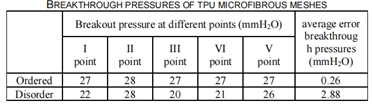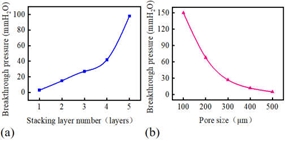 图6. TPU微纤维网堆叠层数和孔径与水突破压力的关系