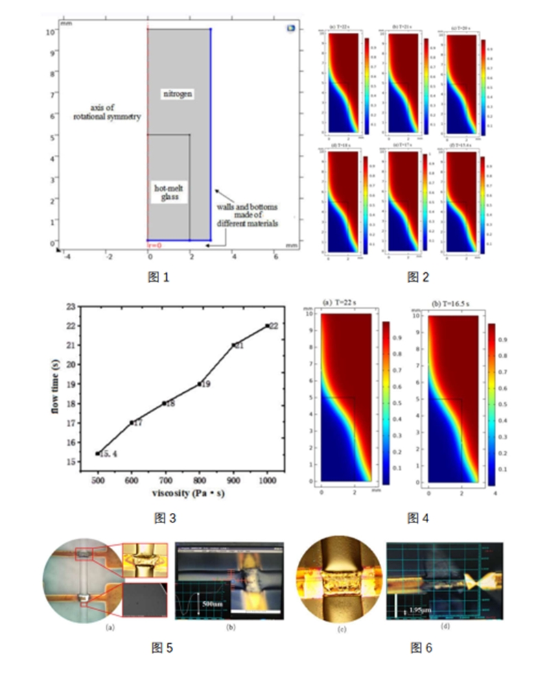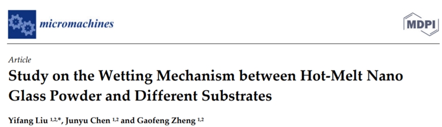 近日,厦门大学航空航天学院郑高峰副教授团队研究了热熔纳米玻璃粉与不同基底间的浸润机理,攻克了纳米玻璃粉在金属引线上的粘附性问题。论文通过仿真研究了熔融纳米玻璃液的整个流动过程,探索了不同热熔玻璃粘度对其在SiO2基底上的流动性的影响以及热熔玻璃液在Au金属引线和SiO2基底上的浸润性和粘附性的比较。并通过实验验证了热熔玻璃液在SiO2基底和Au金属引线上的流动性和粘附性,同时提出了降低其在Au金属引线上的粘附性和增大附着厚度的具体措施。相关工作以“Study on the Wetting Mechanism between Hot-Melt Nano Glass Powder and Different Substrates”为题发表于国际重要期刊《Micromachines》(2022年影响因子3.523,JCR2区)。